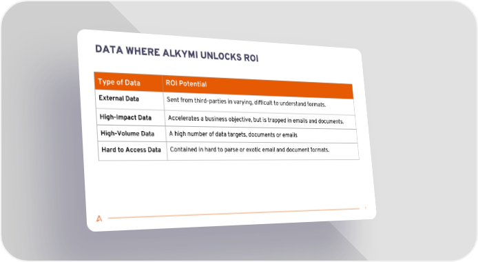 DATA WHERE ALKYMI UNLOCKS ROI Type of Data ROI Potential External Data Sent from third-parties in varying, difficult to understand formats. High-Impact Data Accelerates a business objective, but is trapped in emails and documents. High-Volume Data A high number of data targets, documents or emails Hard to Access Data Contained in hard to parse or exotic email and document formats. 7