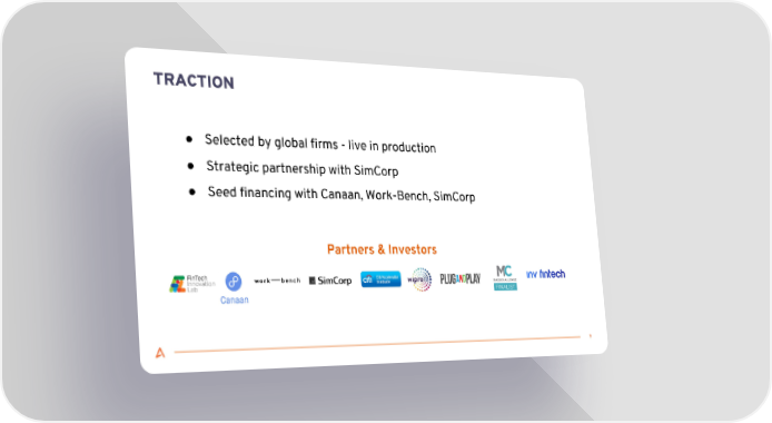 TRACTION ● Selected by global firms - live in production ● Strategic partnership with SimCorp ● Seed financing with Canaan, Work-Bench, SimCorp Partners & Investors 99 Alkymi Page 8 Page 10