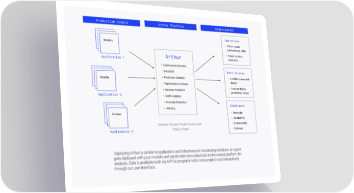 Production Models Arthur Platform Organization Operations Models • Better model performance ($$$) • Faster incident resolution Application 1 Arthur • Continuous Accuracy • Data Drift Data Science Models • Prediction Stability • Feedback on model • Explanations at Scale design • Fairness Analytics • Tools to debug production issues Application 2 • Audit Logging • Anomaly Detection Compliance • Alerting Models • Oversight • Auditability Available On-prem, Private Cloud, Public • Explainability Application 3 Cloud, or SaaS • Fairness Deploying Arthur is similar to application and infrastructure monitoring solutions: an agent gets deployed with your models and sends telemetry data back to the central platform for analysis. Data is available both via API for programmatic consumption and interactively through our user Interface.