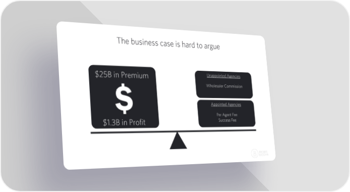 The business case is hard to argue $25B in Premium Unappointed Agencies Wholesaler Commission Appointed Agencies Per Agent Fee $1.3B in Profit Success Fee 24