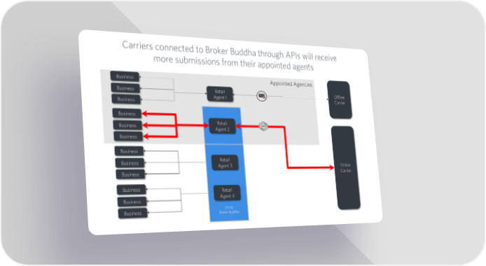 Carriers connected to Broker Buddha through APIs will receive more submissions from their appointed agents Business Appointed Agencies Business Retail Offline Agent 1 Carrier Business Business Retail Business Agent 2 Business Business Business Retail Agent 3 Online Business Carrier Business Retail Business Agent 4 Business Using Broker Buddha