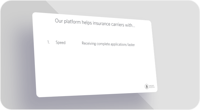 Our platform helps insurance carriers with… 1. Speed Receiving complete applications faster Broker Buddha Page 7 Page 9