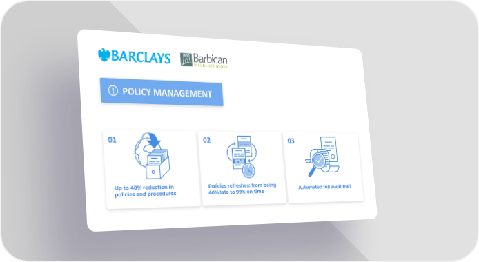 POLICY MANAGEMENT 01 02 03 Up to 40% reduction in Policies refreshes: from being Automated full audit trail policies and procedures 40% late to 99% on time