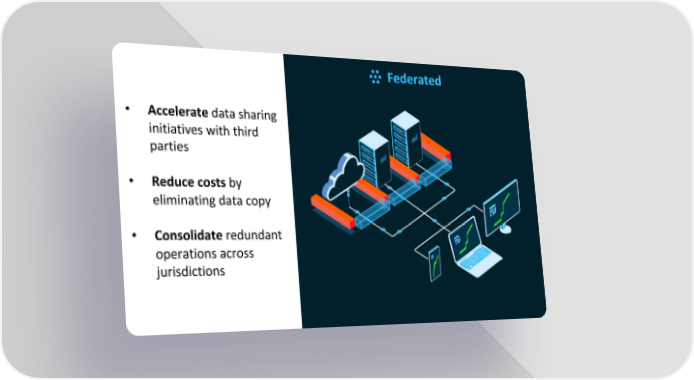 Federated • Accelerate data sharing initiatives with third parties • Reduce costs by eliminating data copy • Consolidate redundant operations across jurisdictions