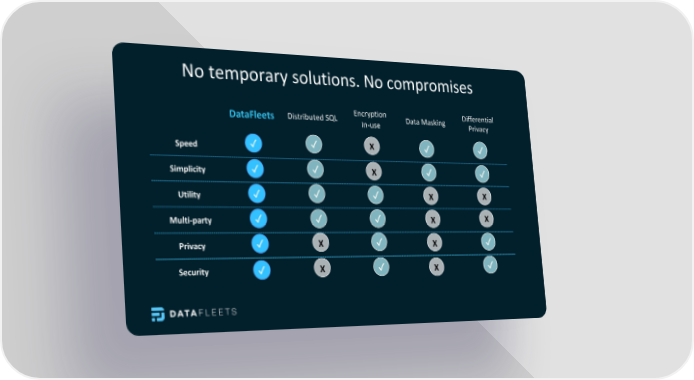 No temporary solutions. No compromises DataFleets Distributed SQL Encryption Data Masking Differential In-use Privacy Speed ✓ ✓ X ✓ ✓ Simplicity ✓ ✓ X ✓ ✓ Utility ✓ ✓ ✓ X X Multi-party ✓ ✓ ✓ X X Privacy ✓ X ✓ X ✓ Security ✓ X ✓ X ✓