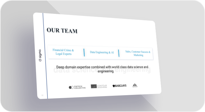 OUR TEAM Financial Crime & Sales, Customer Success & Data Engineering & AI Legal Experts Marketing Deep domain expertise combined with world class data science and data science and engineering engineering 10 Sigma Page 9 Page 11