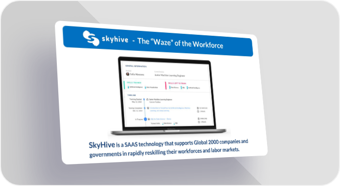 - The “Waze” of the Workforce SkyHiveis a SAAS technology that supports Global 2000 companies and governments in rapidly reskilling their workforces and labor markets. Skyhive Page 3 Page 5