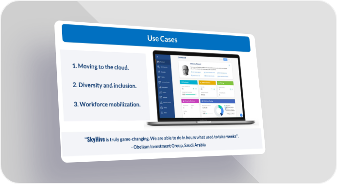 Use Cases 1. Moving to the cloud. 2. Diversity and inclusion. 3. Workforce mobilization. “SkyHiveis truly game-changing. We are able to do in hours what used to take weeks”. - Obeikan Investment Group, Saudi Arabia Skyhive Page 6 Page 8