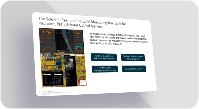 The Solution: Real-time Portfolio Monitoring Risk Tools for Insurance, REITs & Asset Capital Markets As weather events change directions & intensity, True Flood Risk helps clients forecast and monitor the financial impact on portfolio values at risk with different expected levels of flooding, such as 2 in, 4 in, ½ ft, 1 ft & 2 ft. Portfolio Acquisition Pre-Event Risk Mitigation/ Risk Pool Due Diligence Claims Excellence Portfolio Risk Composite Risk Scores Management Monitoring Confidential and Proprietary. 6 Copyright (c) 2020 by TrueFloodRisk.com and Think GeoHazards, Inc. All Rights Reserved.