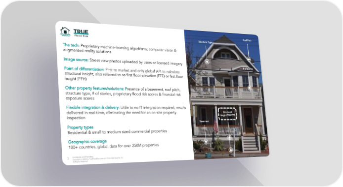 Roof Pitch Structure Type The tech: Proprietary machine-learning algorithms, computer vision & augmented reality solutions Image source: Street view photos uploaded by users or licensed imagery # of stories Point of differentiation: First to market and only global API to calculate structural height, also referred to as first floor elevation (FFE) or first floor height (FFH) Other property features/solutions: P resence of a basement, roof pitch, structure type, # of stories, proprietary flood risk scores & financial risk exposure scores Flexible integration & delivery: Little to no IT integration required, results delivered in real-time, eliminating the need for an on-site property Structural inspection Height/FFH/FFE Basement Property types Residential & small to medium sized commercial properties Geographic coverage 100+ countries, global data for over 250M properties Confidential and Proprietary. 3 Copyright (c) 2020 by TrueFloodRisk.com and Think GeoHazards, Inc. All Rights Reserved.