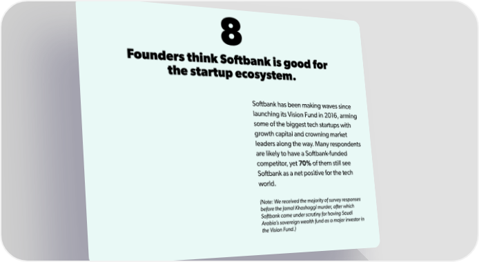 8 Founders think Softbank is good for the startup ecosystem. Softbank has been making waves since launching its Vision Fund in 2016, arming some of the biggest tech startups with growth capital and crowning market leaders along the way. Many respondents are likely to have a Softbank-funded competitor, yet 70% of them still see Softbank as a net positive for the tech world. (Note: We received the majority of survey responses before the Jamal Khashoggi murder, after which Softbank came under scrutiny for having Saudi Arabia’s sovereign wealth fund as a major investor in the Vision Fund.)