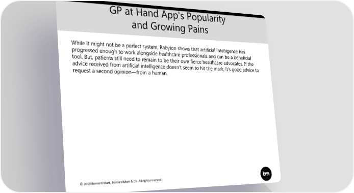GP at Hand App's Popularity and Growing Pains While it might not be a perfect system, Babylon shows that artificial intelligence has progressed enough to work alongside healthcare professionals and can be a beneficial tool. But, patients still need to remain to be their own fierce healthcare advocates. If the advice received from artificial intelligence doesn't seem to hit the mark, it's good advice to request a second opinion—from a human. © 2019 Bernard Marr, Bernard Marr & Co. All rights reserved