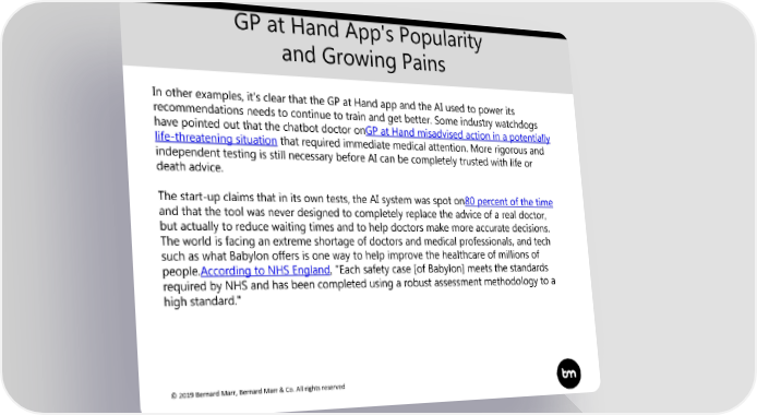 GP at Hand App's Popularity and Growing Pains In other examples, it's clear that the GP at Hand app and the AI used to power its recommendations needs to continue to train and get better. Some industry watchdogs have pointed out that the chatbot doctor onGP at Hand misadvised action in a potentially life-threatening situation that required immediate medical attention. More rigorous and independent testing is still necessary before AI can be completely trusted with life or death advice. The start-up claims that in its own tests, the AI system was spot on80 percent of the time and that the tool was never designed to completely replace the advice of a real doctor, but actually to reduce waiting times and to help doctors make more accurate decisions. The world is facing an extreme shortage of doctors and medical professionals, and tech such as what Babylon offers is one way to help improve the healthcare of millions of people.According to NHS England, "Each safety case [of Babylon] meets the standards required by NHS and has been completed using a robust assessment methodology to a high standard." © 2019 Bernard Marr, Bernard Marr & Co. All rights reserved