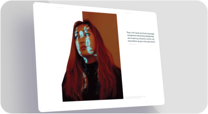 T3 Walking barcodes T3 Walking barcodes “Now, with facial and body language recognition becoming widespread, we’re leaving a physical cookie trail everywhere we go in the real world.” — Fjord Trends 2020 As we become used to being scanned like barcodes, how will privacy and trust issues evolve? 45 46