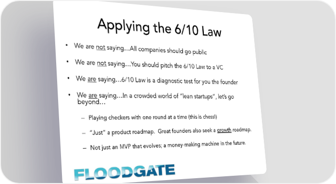 Applying the 6/10 Law • We are not saying…All companies should go public • We are not saying…You should pitch the 6/10 Law to a VC • We are saying…6/10 Law is a diagnostic test for you the founder • We are saying…In a crowded world of “lean startups”, let’s go beyond… – Playing checkers with one round at a time (this is chess!) – “Just” a product roadmap. Great founders also seek a growth roadmap. – Not just an MVP that evolves; a money-making machine in the future.