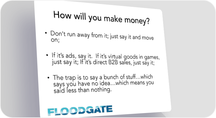 How will you make money? • Don’t run away from it; just say it and move on; • If it’s ads, say it. If it’s virtual goods in games, just say it; If it’s direct B2B sales, just say it; • The trap is to say a bunch of stuff…which says you have no idea…which means you said less than nothing.