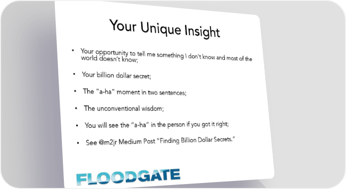 Your Unique Insight • Your opportunity to tell me something I don’t know and most of the world doesn’t know; • Your billion dollar secret; • The “a-ha” moment in two sentences; • The unconventional wisdom; • You will see the “a-ha” in the person if you got it right; • See @m2jr Medium Post “Finding Billion Dollar Secrets.”
