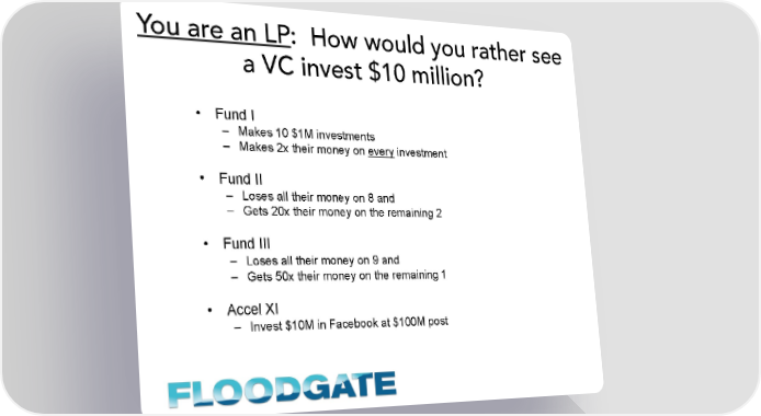 You are an LP: How would you rather see a VC invest $10 million? • Fund I – Makes 10 $1M investments – Makes 2x their money on every investment • Fund II – Loses all their money on 8 and – Gets 20x their money on the remaining 2 • Fund III – Loses all their money on 9 and – Gets 50x their money on the remaining 1 • Accel XI – Invest $10M in Facebook at $100M post