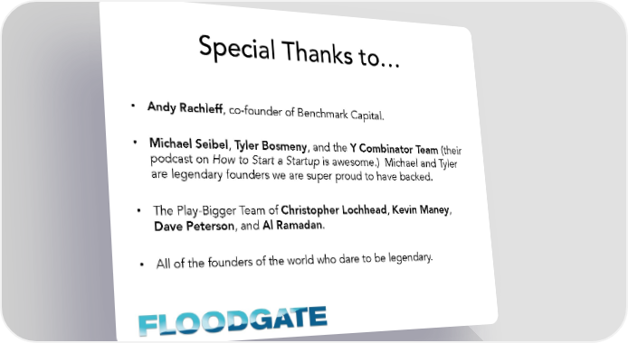 Special Thanks to… • Andy Rachleff, co-founder of Benchmark Capital. • Michael Seibel, Tyler Bosmeny, and the Y Combinator Team (their podcast on How to Start a Startup is awesome.) Michael and Tyler are legendary founders we are super proud to have backed. • The Play-Bigger Team of Christopher Lochhead, Kevin Maney, Dave Peterson, and Al Ramadan. • All of the founders of the world who dare to be legendary.