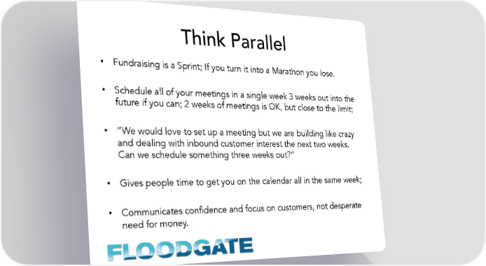 Think Parallel • Fundraising is a Sprint; If you turn it into a Marathon you lose. • Schedule all of your meetings in a single week 3 weeks out into the future if you can; 2 weeks of meetings is OK, but close to the limit; • “We would love to set up a meeting but we are building like crazy and dealing with inbound customer interest the next two weeks. Can we schedule something three weeks out?” • Gives people time to get you on the calendar all in the same week; • Communicates confidence and focus on customers, not desperate need for money.