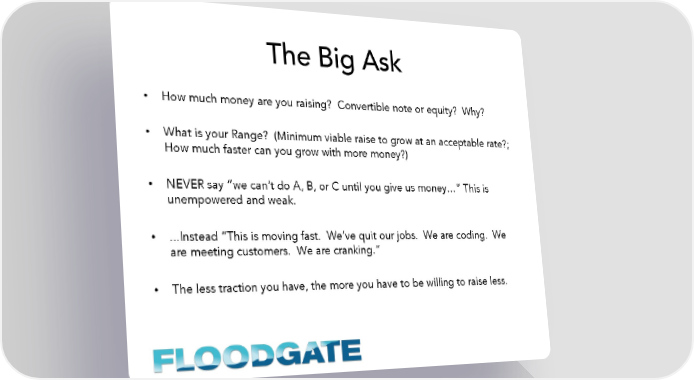The Big Ask • How much money are you raising? Convertible note or equity? Why? • What is your Range? (Minimum viable raise to grow at an acceptable rate?; How much faster can you grow with more money?) • NEVER say “we can’t do A, B, or C until you give us money…” This is unempowered and weak. • ...Instead “This is moving fast. We’ve quit our jobs. We are coding. We are meeting customers. We are cranking.” • The less traction you have, the more you have to be willing to raise less.