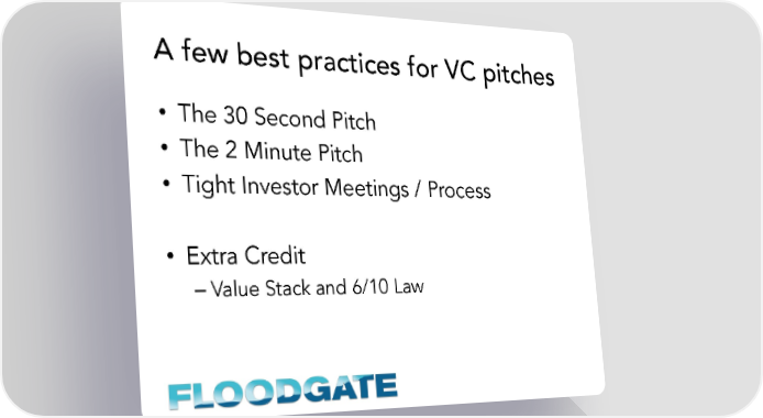 A few best practices for VC pitches • The 30 Second Pitch • The 2 Minute Pitch • Tight Investor Meetings / Process • Extra Credit – Value Stack and 6/10 Law