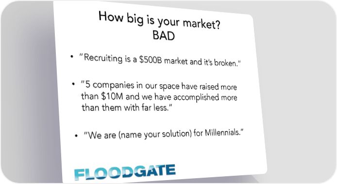 How big is your market? BAD • “Recruiting is a $500B market and it’s broken.” • “5 companies in our space have raised more than $10M and we have accomplished more than them with far less.” • “We are (name your solution) for Millennials.”