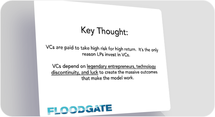 Key Thought: VCs are paid to take high risk for high return. It’s the only reason LPs invest in VCs. VCs depend on legendary entrepreneurs, technology discontinuity, and luck to create the massive outcomes that make the model work.