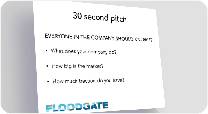30 second pitch EVERYONE IN THE COMPANY SHOULD KNOW IT • What does your company do? • How big is the market? • How much traction do you have?