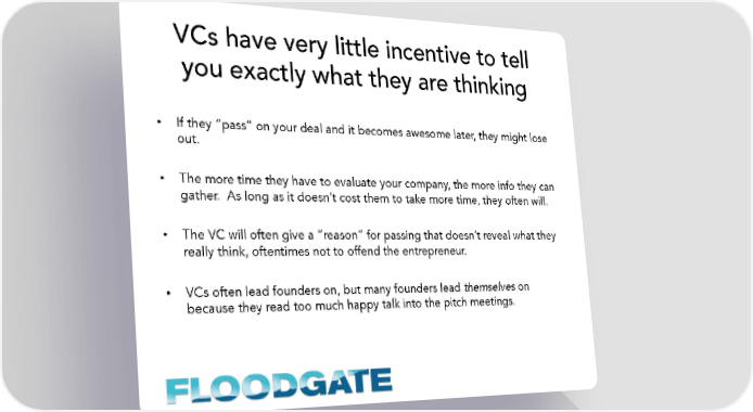 VCs have very little incentive to tell you exactly what they are thinking • If they “pass” on your deal and it becomes awesome later, they might lose out. • The more time they have to evaluate your company, the more info they can gather. As long as it doesn’t cost them to take more time, they often will. • The VC will often give a “reason” for passing that doesn’t reveal what they really think, oftentimes not to offend the entrepreneur. • VCs often lead founders on, but many founders lead themselves on because they read too much happy talk into the pitch meetings.