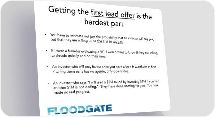 Getting the first lead offer is the hardest part • You have to estimate not just the probability that an investor will say yes, but that they are willing to be the first to say yes. • If I were a founder evaluating a VC, I would want to know if they are willing to decide quickly and on their own. • An investor who will only invest once you have a lead is worthless at first. Pitching them early has no upside; only downsides. • An investor who says “I will lead a $2M round by investing $1M if you find another $1M is not leading.” They have done nothing for you. You have made no real progress.