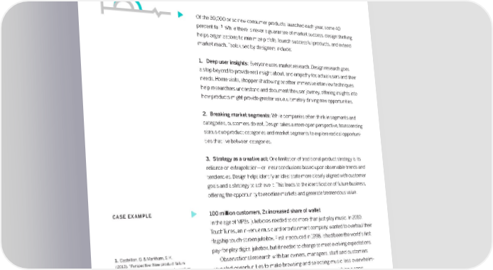 2. Extend market reach Of the 30,000 or so new consumer products launched each year, some 40 1 percent fail. While there is never a guarantee of market success, design thinking helps organizations to minimize pitfalls, launch successful products, and extend market reach. Tools used by designers include: 1. Deep user insights: Everyone uses market research. Design research goes a step beyond to provide real insight about, and empathy for, actual users and their needs. Home visits, shopper shadowing or other immersive interview techniques help researchers understand and document the user journey, offering insights into how products might provide greater value, ultimately driving new opportunities. 2. Breaking market segments: While companies often think in segments and categories, customers do not. Design takes a more open perspective, transcending status quo product categories and market segments to explore radical opportuni- ties that live between categories. 3. Strategy as a creative act: One limitation of traditional product strategy is its reliance on extrapolation—or linear conclusions based upon observable trends and tendencies. Design helps identify an ideal state more closely aligned with customer goals and a strategy to achieve it. This leads to the identification of future business, offering the opportunity to redefine markets and generate tremendous value. CASE EXAMPLE 100 million customers, 2x increased share of wallet In the age of MP3s, jukeboxes needed to do more than just play music. In 2010, TouchTunes, an in-venue music and entertainment company, wanted to overhaul their flagship touch-screen jukebox. First introduced in 1998, it had been the world’s first pay-for-play digital jukebox, but it needed to change to meet evolving expectations. 1. Castellion, G. & Markham, S. K. (2013). “Perspective: New product failure Observational research with bar owners, managers, staff and customers rates: Influence of argumentum ad populum revealed opportunities to make browsing and selecting music less overwhelm- and self-interest.” Journal of Product Innovation Management, 30(5), 976–979 ing. Designers observed that it was rarely a single person picking a song, BUSINESS VALUE OF DESIGN frogdesign.com | 07
