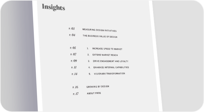 Insights P. 03 MEASURING DESIGN INITIATIVES P. 04 THE BUSINESS VALUE OF DESIGN P. 05 1. INCREASE SPEED TO MARKET P. 07 2. EXTEND MARKET REACH P. 09 3. DRIVE ENGAGEMENT AND LOYALTY P. 11 4. ENHANCE INTERNAL CAPABILITIES P. 14 5. VISIONARY TRANSFORMATION P. 16 GROWING BY DESIGN P. 17 ABOUT FROG BUSINESS VALUE OF DESIGN frogdesign.com |