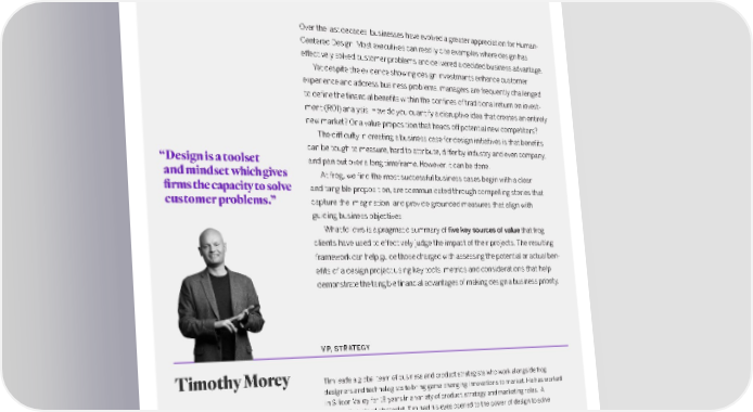 Measuring design initiatives Over the last decades, businesses have evolved a greater appreciation for Human- Centered Design. Most executives can readily cite examples where design has effectively solved customer problems and delivered a decided business advantage. Yet despite the evidence showing design investments enhance customer experience and address business problems, managers are frequently challenged to define the financial benefits within the confines of traditional return on invest- ment (ROI) analysis. How do you quantify a disruptive idea that creates an entirely new market? Or a value proposition that heads off potential new competitors? The difficulty in creating a business case for design initiatives is that benefits can be tough to measure, hard to attribute, differ by industry and even company, “Design is a toolset and pan out over a long timeframe. However, it can be done. and mindset which gives At frog, we find the most successful business cases begin with a clear firms the capacity to solve and tangible proposition, are communicated through compelling stories that customer problems.” capture the imagination, and provide grounded measures that align with guiding business objectives. What follows is a pragmatic summary of five key sources of value that frog clients have used to effectively judge the impact of their projects. The resulting framework can help guide those charged with assessing the potential or actual ben- efits of a design project using key tools, metrics and considerations that help demonstrate the tangible financial advantages of making design a business priority. VP, STRATEGY Timothy Morey Tim leads a global team of business and product strategists who work alongside frog designers and technologists to bring game changing innovations to market. He has worked in Silicon Valley for 18 years in a variety of product, strategy and marketing roles. A classically trained strategist, Tim had his eyes opened to the power of design to solve business challenges through his work at frog. BBUUSINESINESSS S VVALALUE OFUE OF DE DESIGNSIGN frfrogogdedesign.sign.ccomom || 03