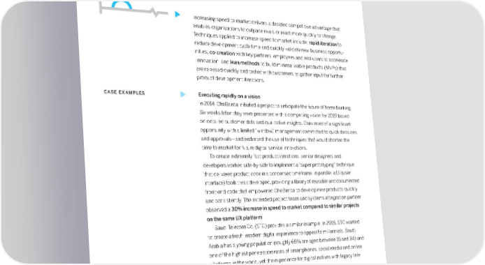 1. Increase speed to market Increasing speed to market delivers a decided competitive advantage that enables organizations to outpace rivals or react more quickly to change. Techniques applied to increase speed to market include: rapid iteration to reduce development cycle time and quickly validate new business opportu- nities; co-creation with key partners, employees and end-users to accelerate innovation; and lean methods to build minimal viable products (MVPs) that are released quickly and tested with customers to gather input for further product development iterations. CASE EXAMPLES Executing rapidly on a vision In 2014, CheBanca initiated a project to anticipate the future of home banking. Six weeks later, they were presented with a compelling vision for 2019 based on detailed customer data and qualitative insights. Convinced of a significant opportunity with a limited “window,” management committed to quick decisions and approvals—and endorsed the use of techniques that would shorten the time to market for future digital service innovations. To create extremely fast product iterations, senior designers and developers worked side-by-side to implement a “super prototyping” technique that delivered product code in a condensed timeframe. In parallel, a UI (user interface) toolkit was developed, providing a library of reusable and documented front-end code that empowered CheBanca to develop new products quickly and consistently. The extended project team and systems integration partner observed a 30% increase in speed to market compared to similar projects on the same UX platform. Saudi Telecom Co. (STC) provides a similar example. In 2015, STC wanted to create a fresh, modern digital experience to appeal to millennials. Saudi Arabia has a young population (roughly 65% are aged between 15 and 34) and one of the highest penetration rates of smartphones, social media and online platforms in the world, yet the experience for digital natives with legacy tele- communication carriers in the region was poor. BUSINESS VALUE OF DESIGN frogdesign.com | 05