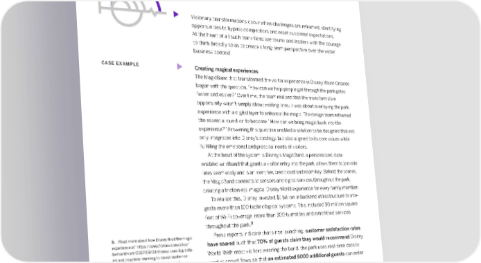 5. Visionary transformation Visionary transformations occur when challenges are reframed, identifying opportunities to bypass competitors and reset customer expectations. At the heart of all such transitions are teams and leaders with the courage to think broadly so as to create a long-term perspective over the wider business context. CASE EXAMPLE Creating magical experiences The MagicBand that transformed the visitor experience in Disney World Orlando began with the question, “How can we help people get through the park gates faster and easier?” Over time, the team realized that the transformative opportunity wasn’t simply about waiting lines; it was about overlaying the park experience with a digital layer to enhance the magic. The design team reframed the essential question to become, “How can we bring magic back into the experience?” Answering this question enabled a solution to be designed that not only integrated into Disney’s strategy, but also aligned to its core values while fulfilling the emotional and practical needs of visitors. At the heart of the system is Disney’s MagicBand, a personalized, data- enabled wristband that grants a visitor entry into the park, allows them to join ride lines seamlessly and is an identifier, credit card and room key. Behind the scenes, the MagicBand connects to sensors and digital services throughout the park, creating a frictionless, magical Disney World experience for every family member. To realize this, Disney invested $1 billion in backend infrastructure to inte- grate more than 100 technological systems. This included 30 million square feet of Wi-Fi coverage, more than 300 turnstiles and retrofitted services throughout the park.3 3. Read more about how Disney fixed the magic Press reports indicate that since launching, customer satisfaction rates experience at “https://www.forbes.com/sites/ have soared such that 70% of guests claim they would recommend Disney bernardmarr/2017/08/24/disney-uses-big-data- iot-and-machine-learning-to-boost-customer- World. With most visitors wearing the band, the park uses real-time data to experience/#7e34fcfa3387” Forbes, and predict crowd flows so that an estimated 5000 additional guests can enter “https://www.wired.com/2015/03/disney- magicband/” WIRED the park each day without degrading the experience. BUSINESS VALUE OF DESIGN frogdesign.com | 14