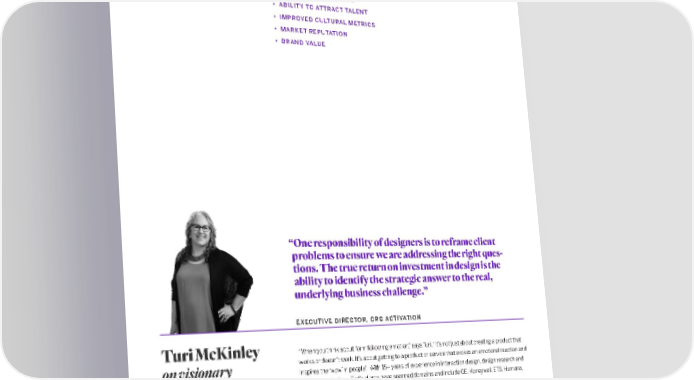 KEY METRICS FOR VISIONARY The Disney example illustrates how design can reimagine a value proposition TRANSFORMATION in the face of shifting consumer expectations, new competitors and business models. Metrics used to help substantiate the validity and measure the suc- cess of such projects include: • NEW PRODUCT REVENUE • ABILITY TO ATTRACT TALENT • IMPROVED CULTURAL METRICS • MARKET REPUTATION • BRAND VALUE “One responsibility of designers is to reframe client problems to ensure we are addressing the right ques- tions. The true return on investment in design is the ability to identify the strategic answer to the real, underlying business challenge.” EXECUTIVE DIRECTOR, ORG ACTIVATION Turi McKinley “When you think about form following emotion,” says Turi, “it’s not just about creating a product that on visionary works or doesn’t work, it’s about getting to a product or service that evokes an emotional reaction and inspires the ‘wow’ in people.” With 15+ years of experience in interaction design, design research and transformation experience strategy, Turi’s clients have spanned domains and include GE, Honeywell, ETS, Humana, Qualcomm, Mars, MTV, Telstra, Colgate and UNICEF. BUSINESS VALUE OF DESIGN frogdesign.com | 15