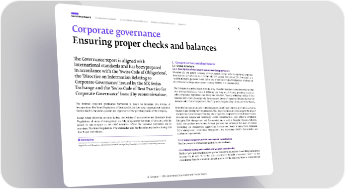 Corporate governance Ensuring proper checks and balances The Governance report is aligned with international standards and has been prepared in accordance with the ‘Swiss Code of Obligations’, the ‘Directive on Information Relating to Corporate Governance’ issued by the SIX Swiss Exchange and the ‘Swiss Code of Best Practice for Corporate Governance’ issued by economiesuisse. The internal corporate governance framework is based on Givaudan SA’s Articles of Incorporation. The ‘Board Regulations of Givaudan SA’, the Company’s organisational regulation, further clarifies the duties, powers and regulations of the governing bodies of the Company. Except when otherwise provided by law, the Articles of Incorporation and Givaudan’s Board Regulations, all areas of management are fully delegated by the Board of Directors, with the power to sub-delegate to the Chief Executive Officer, the Executive Committee and its members. The Board Regulations of Givaudan also specifies the duties and the functioning of its four Board Committees. DOWNLOAD www.givaudan.com ▸ Our company ▸ Corporate governance ▸ Rules and policies ▸ Articles of Incorporation, Board Regulations of Givaudan and other documentation regarding Givaudan’s principles of corporate governance 1. Group structure and shareholders 1.1 Group structure 1.1.1 Description of the issuer’s operational Group structure Givaudan SA, the parent company of the Givaudan Group, with its registered corporate headquarters at 5 Chemin de la Parfumerie, 1214 Vernier, Switzerland (‘the Company’), is a ‘société anonyme’, pursuant to art. 620 et seq. of the Swiss Code of Obligations. It is listed on the SIX Swiss Exchange under security number 1064593, ISIN CH0010645932. The Company is a global leader in its industry. Givaudan operates around the world and has two principal businesses: Taste & Wellbeing and Fragrance & Beauty, providing customers with compounds, ingredients and integrated solutions. Taste & Wellbeing consists of four business units: Dairy, Sweet goods, Beverages and Savoury. Fragrance & Beauty also has four business units: Consumer products; Fine fragrances; Fragrance ingredients and Active Beauty. Both divisions have a sales and marketing presence in all major countries and markets as well as Research and Development organisations. They share resources and knowledge in the areas of research and consumer understanding, where applicable. Corporate functions include Finance, Procurement, Science and Technology, Human Resources (HR), Legal, Ethics & Compliance, Enterprise Risk Management and Communications as well as Givaudan Business Solutions (GBS). GBS provides best-in-class internal processes and services in the areas of Finance, Controlling, HR, Procurement, Supply Chain, Environment, Health & Safety (EHS), Enterprise Data Management, Information Management and Technology (IM&T), Sustainability and Continuous Improvement. 1.1.2 Listed companies within the scope of consolidation The Company does not have any publicly listed subsidiaries. 1.1.3 Unlisted companies within the scope of consolidation The list of principal consolidated companies, their domiciles and the shareholding is presented on pa ge 95, in note 32 to t he 2021 consolidated financial stat ements. Note 1 to the consolidated financial statements as well as note 3 to t he statutory financial statements on Governance Report Compensation Report Consolidated Financial Report Statutory Financial Report Appendix 4 Givaudan — 2021 Governance, Compensation and Financial Report