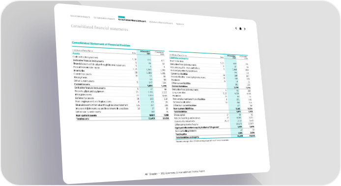 Consolidated Statement of Financial Position in millions of Swiss francs Note 31 December 2021 31 December 2020 Assets Cash and cash equivalents 5, 18 273 411 Derivative financial instruments 5 16 54 Financial assets at fair value through income statement 5 4 4 Accounts receivable - trade 5, 19 1,464 1,359 Inventories 20 1,380 1,201 Current tax assets 16 57 66 Prepayments 65 50 Other current assets 5 147 154 Current assets 3,406 3,299 Derivative financial instruments 5 37 65 Property, plant and equipment 21 2,291 2,222 Intangible assets 22 4,853 4,543 Deferred tax assets 16 182 218 Post-employment benefit plan assets 8 69 20 Financial assets at fair value through income statement 5, 6 297 180 Interests in joint ventures and investments in associates 10 37 35 Other non-current assets 248 76 Non-current assets 8,014 7, 3 5 9 Total assets 11,420 10,658 in millions of Swiss francs Note 31 December 2021 31 December 2020 Liabilities and equity Short-term debt 5, 23 428 206 Derivative financial instruments 5 37 49 Accounts payable - trade and others 5 1,008 809 Accrued payroll and payroll taxes 235 211 Current tax liabilities 16 188 157 Financial liability - own equity instruments 26 148 108 Provisions 25 13 23 Other current liabilities 261 233 Current liabilities 2,318 1,796 Derivative financial instruments 5 61 103 Long-term debt 5, 23 4,239 4,245 Provisions 25 83 71 Post-employment benefit plan liabilities 8 371 545 Deferred tax liabilities 16 280 310 Other non-current liabilities 127 80 Non-current liabilities 5,161 5,354 Total liabilities 7, 4 7 9 7, 1 5 0 Share capital 27 92 92 Retained earnings and reserves 27 6,365 6,133 Own equity instruments 26, 27 (211) (168) Other components of equity (2,317) (2,567) Equity attributable to equity holders of the parent 3,929 3,490 Non-controlling interests 12 18 Total equity 3,941 3,508 Total liabilities and equity 11,420 10,658 The notes on pages 46 to 97 form an integral part of these financial statements. 43 Givaudan — 2021 Governance, Compensation and Financial Report Governance Report Compensation Report Consolidated Financial Report Statutory Financial Report Appendix Consolidated financial statements
