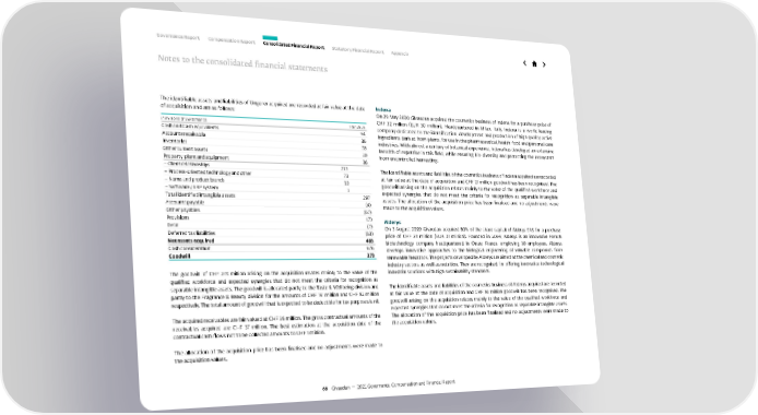 The identifiable assets and liabilities of Ungerer acquired are recorded at fair value at the date of acquisition and are as follows: in millions of Swiss francs Fair value Cash and Cash equivalents 94 Accounts receivable 36 Inventories 78 Other current assets 10 Property, plant and equipment 36 – Client relationships 213 – Process-oriented technology and other 73 – Name and product brands 10 – Software / ERP system 1 Total identified intangible assets 297 Accounts payable (4) Other payables (67) Provisions (7) Debt (7) Deferred tax liabilities (63) Net assets acquired 403 Cash consideration 676 Goodwill 273 The goodwill of CHF 273 million arising on the acquisition relates mainly to the value of the qualified workforce and expected synergies that do not meet the criteria for recognition as separable intangible assets. The goodwill is allocated partly to the Taste & Wellbeing division and partly to the Fragrance & Beauty division for the amounts of CHF 191 million and CHF 82 million respectively. The total amount of goodwill that is expected to be deductible for tax purposes is nil. The acquired receivables are fair valued at CHF 36 million. The gross contractual amounts of the receivables acquired are CHF 37 million. The best estimation at the acquisition date of the contractual cash flows not to be collected amounts to CHF 1 million. The allocation of the acquisition price has been finalised and no adjustments were made to the acquisition values. Indena On 29 May 2020 Givaudan acquired the cosmetics business of Indena for a purchase price of CHF 32 million (EUR 30 million). Headquartered in Milan, Italy, Indena is a world leading company dedicated to the identification, development and production of high quality active ingredients derived from plants, for use in the pharmaceutical, health-food and personal care industries. With almost a century of botanical experience, Indena has developed an extensive breadth of expertise in this field, while ensuring bio-diversity and protecting the ecosystem from uncontrolled harvesting. The identifiable assets and liabilities of the cosmetics business of Indena acquired are recorded at fair value at the date of acquisition and CHF 21 million goodwill has been recognised. The goodwill arising on the acquisition relates mainly to the value of the qualified workforce and expected synergies that do not meet the criteria for recognition as separable intangible assets. The allocation of the acquisition price has been finalised and no adjustments were made to the acquisition values. Alderys On 3 August 2020 Givaudan acquired 80% of the share capital of Alderys SAS for a purchase price of CHF 23 million (EUR 21 million). Founded in 2009, Alderys is an innovative French biotechnology company headquartered in Orsay, France, employing 30 employees. Alderys develops innovative approaches to the biological engineering of valuable compounds from renewable feedstock. The projects developed by Alderys are aimed at the chemical and cosmetic industry sectors as well as nutrition. They are recognised for offering innovative technological industrial solutions with high sustainability standards. The identifiable assets and liabilities of the cosmetics business of Alderys acquired are recorded at fair value at the date of acquisition and CHF 10 million goodwill has been recognised. The goodwill arising on the acquisition relates mainly to the value of the qualified workforce and expected synergies that do not meet the criteria for recognition as separable intangible assets. The allocation of the acquisition price has been finalised and no adjustments were made to the acquisition values. 69 Givaudan — 2021 Governance, Compensation and Financial Report Governance Report Compensation Report Consolidated Financial Report Statutory Financial Report Appendix Notes to the consolidated financial statements
