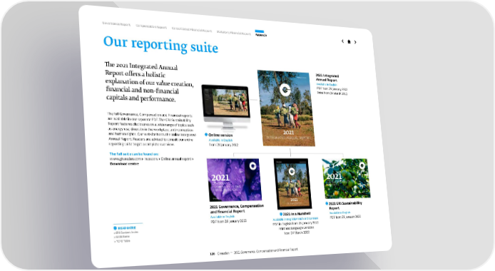 Our reporting suite The 2021 Integrated Annual Report offers a holistic explanation of our value creation, financial and non-financial capitals and performance. The full Governance, Compensation and Financial reports are available in one separate PDF. The GRI Sustainability Report features disclosures on a wide range of topics such as energy use, diversity in the workplace, anti-corruption and human rights. Our website hosts the online Integrated Annual Report. Readers are advised to consult our entire reporting suite to get a complete overview. The full suite can be found on: www.givaudan.com ▸ Investors ▸ Online annual report ▸ Download centre 2021 Integrated Annual Report Available in English PDF from 28 January 2022 Print from 24 March 2022 Online version Available in English from 28 January 2022 2021 Governance, Compensation and Financial Report Available in English PDF from 28 January 2022 2021 In a Nutshell Available in English, French and German PDF in English from 28 January 2022 Print and language versions from 24 March 2022 2021 GRI Sustainability Report Available in English PDF from 28 January 2022 READ MORE ▸ GRI Content Index ▸ SASB Table ▸ TCFD Table 126 Givaudan — 2021 Governance, Compensation and Financial Report Governance Report Compensation Report Consolidated Financial Report Statutory Financial Report Appendix