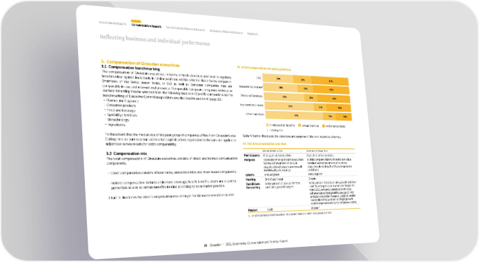 3. Compensation of Givaudan executives 3.1 Compensation benchmarking The compensation of Givaudan executives, in terms of both structure and level, is regularly benchmarked against individuals in similar positions within selected listed Swiss companies (members of the Swiss Leader Index, or SLI) as well as European companies that are comparable in size and international presence. Comparable European companies included in our benchmarking may be selected from the following industries (Specific companies used for benchmarking of Executive Committee positions are disclosed in section 4.1 page 32): – Flavour and fragrance – Consumer products – Food and beverage – Speciality chemicals – Biotechnology – Ingredients. To the extent that the median size of the peer group of companies differs from Givaudan’s size (taking into account revenue and market capitalisation), regression techniques are applied to adjust raw survey results for strict comparability. 3.2 Compensation mix The total compensation of Givaudan executives consists of direct and indirect compensation components. – Direct compensation consists of base salary, annual incentive and share-based components. – Indirect compensation includes retirement coverage, health benefits, death and disability protection as well as certain benefits-in-kind according to local market practice. Chart III illustrates the direct compensation mix at target for Givaudan executives in 2021. III. Direct compensation mix policy guidelines Fixed pay (incl. benefits) Annual incentive Performance shares 1. Excluding CEO . Other Executives Key Functional Heads Divisional C omittees Executive C ommittee ¹ CEO % % % % % % % % % % % % % % % Table IV below illustrates the structure and purpose of the two incentive schemes. IV. Variable compensation overview Annual Incentive Plan Performance Share Plan Participants Managers and executives Key talent and executives Purpose To reward managers and executives for the achievement of annual organisational targets and overall individual performance To link compensation to shareholder value creation and achievement of business objectives including the Givaudan purpose ambitions Grants Annual grant Annual grant Vesting End of each year 3 years Conditions for vesting Achievement of annual EBITDA and sales growth targets Achievement of relative sales growth and free cash flow targets over 4 years and for grants from 2021 onwards, targets also include achievement of net greenhouse gas (GHG) emission reduction (scope 1, 2 and 3), senior leader diversity (women and high growth market representation) and employee safety Payout Cash Shares ¹ 1. Unless local laws prevent allocation of Givaudan shares, in which case payout is in cash. Reflecting business and individual performance Governance Report Compensation Report Consolidated Financial Report Statutory Financial Report Appendix 26 Givaudan — 2021 Governance, Compensation and Financial Report