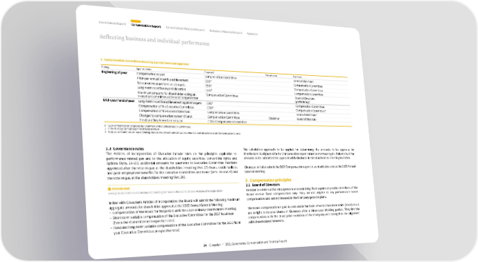 1.3 Governance rules The Articles of Incorporation of Givaudan include rules on the principles applicable to performance-related pay and to the allocation of equity securities, convertible rights and options (Arts. 23–25), additional amounts for payments to Executive Committee members appointed after the vote on pay at the shareholders’ meeting (Art. 27), loans, credit facilities and post-employment benefits for the Executive Committee and Board (Arts. 30 and 31) and the vote on pay at the shareholders’ meeting (Art. 26). DOWNLOAD www.givaudan.com ▸ Our company ▸ Corporate governance ▸ Rules and policies ▸ Articles of incorporation In line with Givaudan’s Articles of Incorporation, the Board will submit the following maximum aggregate amounts for shareholder approval at the 2022 Annual General Meeting: – Compensation of the Board for the period until the 2023 ordinary shareholders’ meeting – Short-term variable compensation of the Executive Committee for the 2021 fiscal year (Executive Committee retrospective vote) – Fixed and long-term variable compensation of the Executive Committee for the 2022 fiscal year (Executive Committee prospective vote) The calculation approach to be applied for determining the amounts to be approved by shareholders is aligned with the Compensation report valuation methodologies. Full details of the amounts to be submitted for approval will be included in the shareholders’ meeting invitation. Givaudan will also submit the 2021 Compensation report to a consultative vote at the 2022 Annual General Meeting. 2. Compensation principles 2.1 Board of Directors In order to reinforce their independence in exercising their supervisory duties, members of the Board receive fixed compensation only. They are not eligible to any performance-based compensation and are not insured in the Company pension plans. The Board compensation is paid in cash and in the form of Restricted Share Units (RSUs). RSUs are a right to receive shares of Givaudan after a three-year blocking period. They link the compensation with the share price evolution of the Company and strengthen the alignment with shareholders’ interests. I. Compensation Committee standing agenda items and approval Timing Agenda items Proposed ¹ Consultation Approved Beginning of year Compensation report Compensation Committee Board of Directors ³ Prior year annual incentive achievement CEO ² Compensation Committee Set current year performance targets CEO ² Compensation Committee Long-term incentive award allocation CEO ² Compensation Committee Maximum amounts for shareholder voting on Executive Committee and Board compensation Compensation Committee Board of Directors (preliminary) ³ Mid-year / end of year Long-term incentive achievement against targets CEO ² Compensation Committee Compensation of the Executive Committee CEO ² Compensation Committee ³ Compensation of the Board of Directors Compensation Committee Board of Directors ³ Changes to compensation system (if any) Compensation Committee Chairman Board of Directors Preview of key items for next year CEO / Compensation Committee – 1. CEO compensation proposed by Chairman of the Compensation Committee. 2. Individual concerned does not attend/abstains. 3. Subject to shareholders’ vote (binding vote on maximum compensation amounts, consultative vote on Compensation report). Reflecting business and individual performance Governance Report Compensation Report Consolidated Financial Report Statutory Financial Report Appendix 24 Givaudan — 2021 Governance, Compensation and Financial Report