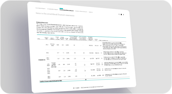 Hedge positions closed The Group closed several financial instruments which had been entered into to protect against future increases in interest rate, while also fixing the interest rate on future debt issuance. The corresponding losses which have been recorded in equity will be recycled in the income statement (Financing costs) over the period of the cash flow initially hedged, although the period of cash flows of the newly issued debt is sometimes different. The transactions have the following characteristics: Entity Inception date Type of Instrument Currency of Instrument Notional amount in millions Average rate Fair value of financial instrument at the date of settlement in millions of Swiss francs Amount recycled in the income statement over the period in millions of Swiss francs Starting date of recycling through income statement Maturity Date Tranche Assigned to debt Givaudan SA 2012 Treasury locks USD 100 1.80% (1) – Feb 2013 Feb 2023 10Y Private Placements for a total of USD 250 million, respectively USD 40 million redeemable in February 2020 with an annual interest rate of 2.74%, USD 150 million redeemable in February 2023 with an annual interest rate of 3.30% and USD 60 million redeemable in February 2025 with an annual interest rate of 3.45%. 2012 Forward starting interest rate swaps CHF 0 75 1.63% (8) (2) Dec 2016 Dec 2021 5Y Public bond for a total of CHF 300 million, respectively CHF 100 million at a rate of 0.000% with 6 year maturity and CHF 200 million at a rate of 0.625% with 15 year maturity. 2012 2014 CHF 150 1.90% (15) (3) Apr 2018 Apr 2023 5Y Public bond for a total of CHF 350 million, respectively CHF 150 million at a floating rate with 2 year maturity and CHF 200 million at a rate of 0.375% with 7 year maturity. June 2018 EUR 400 1.05% (1) (5) – (1) Sep 2018 Sep 2025 Sep 2028 7Y 10Y Dual tranche placement of Euro bond totalling EUR 1,300 million, respectively of EUR 500 million at a rate of 1.125% for 7 years and EUR 800 million at a rate of 2.000% for 12 years. 2014 2015 2018 2019 CHF 125 1.40% (2) (20) – (2) Nov 2020 Nov 2025 Nov 2028 5Y 8Y Public bond of CHF 150 million at a rate of 0.150% with 8 year maturity. 2014 2015 CHF 125 2.05% (25) – Dec 2021 Jun 2030 8.5Y Public bond of CHF 150 million at a rate of 0.375% with 10 year maturity. Total for the year ended 31 December 2021 (8) 64 Givaudan — 2021 Governance, Compensation and Financial Report Governance Report Compensation Report Consolidated Financial Report Statutory Financial Report Appendix Notes to the consolidated financial statements