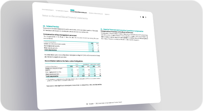 30. Related Parties Transactions between Givaudan SA and its subsidiaries, which are related parties of Givaudan SA, have been eliminated on consolidation and are not disclosed in this note. Compensation of key management personnel The compensation of the Board of Directors and the Executive Committee during the year was as follows: in millions of Swiss francs 2021 2020 Salaries and other short-term benefits 15 14 Post-employment benefits 2 1 Share-based payments 15 12 Total compensation 32 27 No other related party transactions have taken place during 2021 (2020: nil) between the Group and the key management personnel. Reconciliation table to the Swiss code of obligations in millions of Swiss francs IFRS Adjustments a Swiss CO (Art. 663b bⁱs) 2021 2020 2021 2020 2021 2020 Salaries and other short-term benefits 15 14 (7) (6) 8 8 Post-employment benefits 2 1 1 2 2 Share-based payments 15 12 (5) (2) 10 10 Total compensation 32 27 (12) (7) 20 20 a) IFRS information is adjusted mainly to the recognition of the share-based payments, IFRS 2 versus economic value at grant date. IFRS information also includes security costs. There are no other significant related party transactions including in the jointly controlled entities. 31. Board of Directors and Executive Committee Compensation Compensation of members of the Board of Directors Compensation of Board members consists of Director fees, Committee fees and Restricted Share Units (RSUs). Fees are paid at the end of each year in office completed. RSUs give participants the right to receive Givaudan shares (or a cash equivalent in countries where securities laws prevent the offering of Givaudan securities) at the end of a three-year blocking period. Governance Report Compensation Report Consolidated Financial Report Statutory Financial Report Appendix 91 Givaudan — 2021 Governance, Compensation and Financial Report Notes to the consolidated financial statements