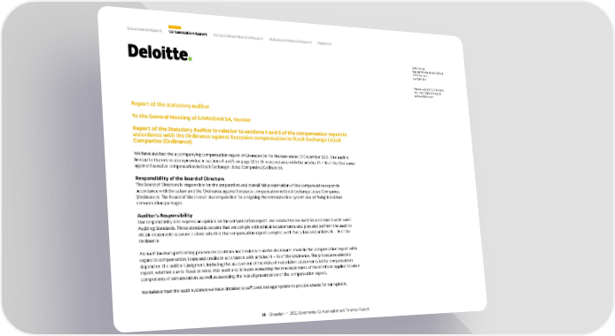 Deloitte SA Rue du Pré-de-la-Bichette 1 1202 Geneva Switzerland Phone: +41 (0)58 279 8000 Fax: +41 (0)58 279 8800 www.deloitte.ch Report of the statutory auditor To the General Meeting of GIVAUDAN SA, Vernier Report of the Statutory Auditor in relation to sections 4 and 5 of the compensation report in accordance with the Ordinance against Excessive compensation in Stock Exchange Listed Companies (Ordinance) We have audited the accompanying compensation report of Givaudan SA for the year ended 31 December 2021. Our audit is limited to the information provided in sections 4 and 5 on page 32 to 36 in accordance with the articles 14 – 16 of the Ordinance against Excessive compensation in Stock Exchange Listed Companies (Ordinance). Responsibility of the Board of Directors The Board of Directors is responsible for the preparation and overall fair presentation of the compensation report in accordance with Swiss law and the Ordinance against Excessive compensation in Stock Exchange Listed Companies (Ordinance). The Board of Directors is also responsible for designing the remuneration system and defining individual remuneration packages. Auditor’s Responsibility Our responsibility is to express an opinion on the compensation report. We conducted our audit in accordance with Swiss Auditing Standards. Those standards require that we comply with ethical requirements and plan and perform the audit to obtain reasonable assurance about whether the compensation report complies with Swiss law and articles 14 – 16 of the Ordinance. An audit involves performing procedures to obtain audit evidence on the disclosures made in the compensation report with regard to compensation, loans and credits in accordance with articles 14 – 16 of the Ordinance. The procedures selected depend on the auditor’s judgment, including the assessment of the risks of material misstatements in the compensation report, whether due to fraud or error. This audit also includes evaluating the reasonableness of the methods applied to value components of remuneration, as well as assessing the overall presentation of the compensation report. We believe that the audit evidence we have obtained is sufficient and appropriate to provide a basis for our opinion. Governance Report Compensation Report Consolidated Financial Report Statutory Financial Report Appendix 38 Givaudan — 2021 Governance, Compensation and Financial Report