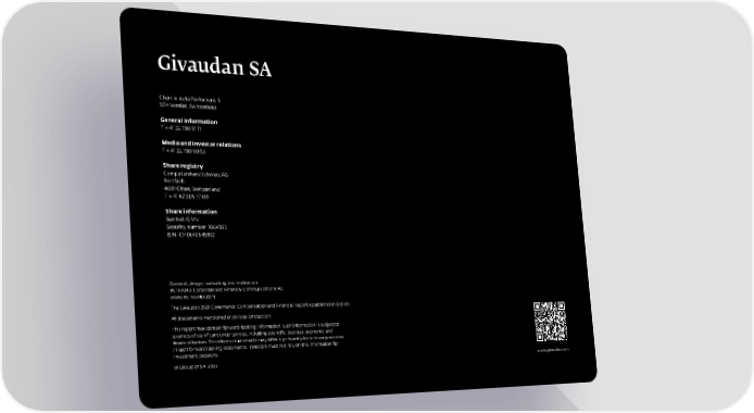 Givaudan SA Chemin de la Parfumerie 5 1214 Vernier, Switzerland General information T + 41 22 780 91 11 Media and investor relations T + 41 22 780 90 53 Share registry Computershare Schweiz AG Postfach 4601 Olten, Switzerland T + 41 62 205 77 00 Share information Symbol: GIVN Security number: 1064593 ISIN: CH0010645932 Concept, design, consulting and realisation: PETRANIX Corporate and Financial Communications AG www.PETRANIX.com The Givaudan 2021 Governance, Compensation and Financial Report is published in English. All trademarks mentioned enjoy legal protection. This report may contain forward-looking information. Such information is subject to a variety of significant uncertainties, including scientific, business, economic and financial factors. Therefore actual results may differ significantly from those presented in such forward looking statements. Investors must not rely on this information for investment decisions. © Givaudan SA, 2022 www.givaudan.com