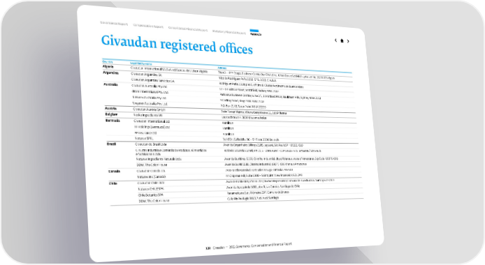 Givaudan registered offices Country Legal Entity name Address Algeria Givaudan International SA (Suisse) Bureau de Liaison Algérie Tour A – 4 ème Etage, Business Centre Dar El Madina, Micro Zone d’activité Hydra Lot No. 20, 16035 Algers Argentina Givaudan Argentina SA Nicolàs Rodriguez Peña 1568, 5 ° B, 1021, C.A.B.A. Givaudan Argentina Servicios SA Rodriguez Peña 1568, piso 5, oficina B, Ciudad Autónoma de Buenos Aires Australia Givaudan Australia Pty Ltd 12 – 14 Britton Street, Smithfield, Sydney NSW 2164 drom International Pty. Ltd. Parkview Business Centre, suite 2/1, 1 Maitland Place, Baulkham HIlls, Sydney, NSW 2153 Naturex Australia Pty Ltd 9 Garling Road, Kings Park NSW 2148 Ungerer Australia Pty. Ltd. P.O. Box 2143, Taren Point NSW 22229 Austria Givaudan Austria GmbH Twin Tower Vienna, Wienerbergstrasse 11, 1109 Vienna Belgium Naska Ingredients NV Lausbedstraat 4, 3630 Maasmechelen Bermuda Givaudan International Ltd Hamilton FF Holdings (Bermuda) Ltd Hamilton FF Insurance Ltd Hamilton Naturex SPRL Val d’Or, Gulledelle, 96 – 5 th Floor, 1200 Brussels Brazil Givaudan do Brasil Ltda Avenida Engenheiro Billings 2185, Jaguaré, São PauloSP – 05321-010 G. Nutra Industria e Comércio de Produtos. Alimenticios e Nutricionais Ltda Rodovia Eduardo Zucari, Km 21,5 - Zona Rural - CEP 18603-970, Botucatu/ São Paulo Naturex Ingredients Naturais Ltda Avenida Buriti no. 5.391, Distrito Industrial, city of Manaus, state of Amazonas, Zip Code: 69075-000 DDW, The Color House Avenida Buriti 5680, Distrito Industrial, 69075-000 Manaus Amazonas Canada Givaudan Canada Co. 2400 Matheson Blvd. East, Mississauga, Ontario L4W 5G9 Naturex Inc (Canada) 44 Chipman Hill, Suite 1000 – Saint John, New Brunswick E2L 2A9 Chile Givaudan Chile Ltda Avda Del Valle 869, oficina 203, Ciudad Empresarial, Comuna de Huechuraba, Santiago de Chile Naturex CHILE SPA Avenida Apoquindo 3001, piso 9, Las Condes, Santiago de Chile Chile Botanics SPA Panamericana Sur, Kilómetro 297, Comuna de Linares DDW, The Color House Calle Rio Reefugio 9663, Pudahuel, Santiago 120 Givaudan — 2021 Governance, Compensation and Financial Report Governance Report Compensation Report Consolidated Financial Report Statutory Financial Report Appendix