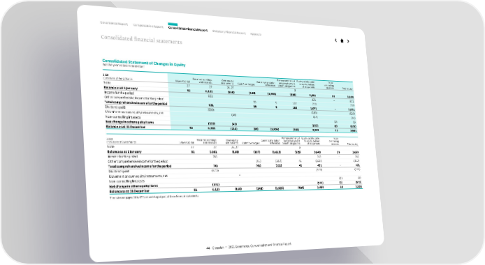 Consolidated Statement of Changes in Equity For the year ended 31 December 2021 in millions of Swiss francs Share Capital Retained earnings and reserves Own equity instruments Cash flow hedges Currency translation differences Remeasurement of post employment benefit obligations Equity attributable to equity holders of the parents Non- controlling interests Total equity Note 27 27 26, 27 8 Balance as at 1 January 92 6,133 (168) (148) (1,935) (484) 3,490 18 3,508 Income for the period 821 821 – 821 Other comprehensive income for the period 59 9 182 250 250 Total comprehensive income for the period 821 59 9 182 1,071 – 1,071 Dividends paid (589) (589) (589) Movement on own equity instruments, net (43) (43) (43) Non-controlling interests (6) (6) Net change in other equity items (589) (43) (632) (6) (638) Balance as at 31 December 92 6,365 (211) (89) (1,926) (302) 3,929 12 3,941 2020 in millions of Swiss francs Share Capital Retained earnings and reserves Own equity instruments Cash flow hedges Currency translation differences Remeasurement of post employment benefit obligations Equity attributable to equity holders of the parents Non- controlling interests Total equity Note 27 27 26, 27 8 Balance as at 1 January 92 5,961 (168) (107) (1,613) (525) 3,640 19 3,659 Income for the period 743 743 – 743 Other comprehensive income for the period (41) (322) 41 (322) (322) Total comprehensive income for the period 743 (41) (322) 41 421 – 421 Dividends paid (571) (571) (571) Movement on own equity instruments, net – Non-controlling interests (1) (1) Net change in other equity items (571) (571) (1) (572) Balance as at 31 December 92 6,133 (168) (148) (1,935) (484) 3,490 18 3,508 The notes on pages 46 to 97 form an integral part of these financial statements. 44 Givaudan — 2021 Governance, Compensation and Financial Report Governance Report Compensation Report Consolidated Financial Report Statutory Financial Report Appendix Consolidated financial statements