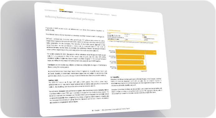 A payout of 200% would require an achievement level above the maximum threshold for both criteria. An achievement level below the minimum threshold on either measure results in a 0% payout. Different combinations of relative sales growth and FCF achievements within the above ranges lead to payouts between 0% and 200%, ranked according to their long-term economic value generation for the Company. The outcome of the matrix payout approach is that outperformance on one performance criteria can be counterbalanced in the event of underperformance on the other. Accordingly, the weighting of impact for each performance criteria differs depending on the positioning within the matrix shown in table VIII. For awards granted in 2021, the payouts will be calculated using the payout matrix as per table VIII as previously for 80% of the award value at grant, and the other 20% will be calculated against People and Nature targets described on page 31. For each performance target as well as for the overall PSP achievement rate, a payout cap of 200% applies. Participants do not receive any dividends or have any voting rights in respect of Performance Shares during the vesting period. In general, Performance Shares lapse on cessation of employment. In specific circumstances such as death, disability or retirement, Performance Shares may vest subject to satisfaction of the performance criteria. In case of a change of control, Performance Shares may vest immediately. Vesting in 2021 The 2018 PSP vested on 15 April 2021 with a 140% payout. This reflects above target achievement on FCF and above target achievement on relative sales growth, as displayed in table X. Historical long-term incentive achievement is shown in table XI. For reference, Givaudan tests performance against other benchmark metrics, including relative total shareholder return (TSR), and it continues to outperform the market in many regards. For instance, Givaudan’s TSR measured over the latest three-year vesting period has generally been at or above third quartile when compared to local Swiss companies, related industry companies and the Company's benchmark peer group. Therefore Givaudan’s performance, return to shareholders and executive compensation remain aligned. X. 2018 PSP achievement Criteria Performance Payout Average like-for-like sales growth compared to peer group +1.1% 140% of performance shares granted Cumulative FCF / sales ¹ 12.5% 1. Formula = Σ (FCF margin reporting year x sales in reporting currency in year / Σ Sales in reporting currency in year). XI. Historical long-term incentive achievement Ta rget 100% 2018 vesting (2015 PSP) 2019 vesting (2016 PSP) 2020 vesting (2017 PSP) 2021 vesting (2018 PSP) % % % % 3.7 Benefits Executive Committee members participate in the benefit plans of the Company, consisting mainly of retirement, insurance and health care plans that are designed to provide a reasonable level of protection for the employees and their dependents in respect of the risks of retirement, ill-health, disability and death. Executive Committee members are also provided with certain executive perquisites and benefits in kind according to competitive market practice. The aggregate monetary value of these benefits is evaluated at fair value and disclosed in the compensation tables. Reflecting business and individual performance Governance Report Compensation Report Consolidated Financial Report Statutory Financial Report Appendix 31 Givaudan — 2021 Governance, Compensation and Financial Report